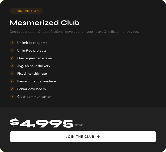 Join Mesmerized Club and get instant access to a dedicated senior developer for a flat monthly fee.